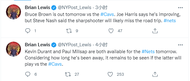 来源:JRS直播网11-22 11:33JRS直播网11月22日讯 ,篮网最新伤情出炉,据篮网记者Brian Lewis报道,杜兰特和米尔萨普复出,小布朗因腿筋紧张而缺战骑士,纳什还透露乔-哈里斯的伤情,至少再缺席两场比赛。