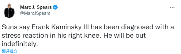 此前,28岁的卡明斯基因膝盖伤势已经连续缺战2场,如今确诊为右膝有压力反应,将无限期休战,没有复出时间表;本赛季,卡明斯基为太阳替补出战9场比赛,场均上场20.1分钟能够得到10.6分4.6篮板1.4助攻,三项命中率分别是54.5%、33.3%和90%。