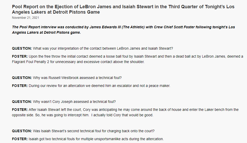 主裁福斯特:在罚球的时候,最初的认定是斯图尔特的无球犯规,然后勒布朗在死球后的动作被认为是一个明显的二级恶意,因为是肩膀以上的不必要和过度动作。