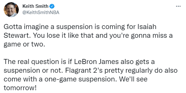 詹姆斯被驱逐事件引热议,赛后名记Keith Smith发推写道:以赛亚-斯图尔特即将停赛。你就这样输了,你会错过一两场比赛。 真正的问题是勒布朗-詹姆斯是否也会被禁赛。 二级恶犯经常被禁赛一场。我们明天见!