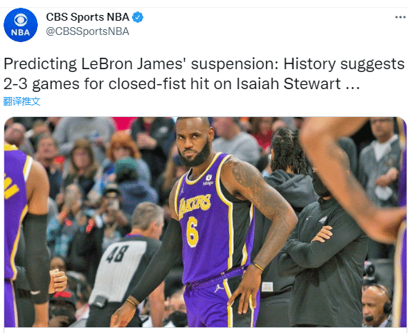 美媒CBS Sports NBA预测詹姆斯可能被禁赛2-3场。