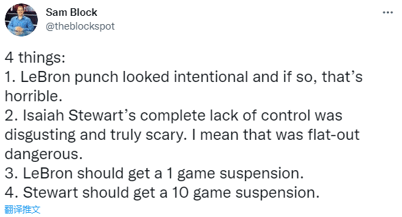 Sam Block发推:需要注意4件事: 1. 勒布朗一拳看起来是故意的,如果是这样,那太可怕了。 2. 以赛亚-斯图尔特的完全失控令人害怕,我的意思是那太危险了。 3. 勒布朗应该被禁赛 1 场。 4. 斯图尔特应该被禁赛 10 场。