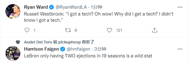 湖人记者Harrison Faigen发推:詹姆斯19个赛季仅仅被驱逐2次太狂野了。