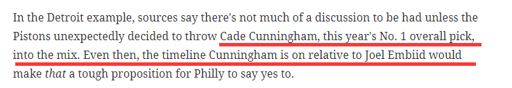 76人又一次狮子大开口,除非活塞愿意把坎宁安+格兰特同时摆上货架,否则关于西蒙斯的交易就不用谈了;而且该记者还在文章中提到,即使活塞愿意,坎宁安+恩比德的组合也很难让76人同意这笔交易。