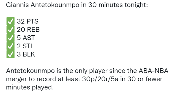 第二、字母哥成为自从ABA-NBA合并以来唯一一位在30分钟或更少时间内至少拿到30分20篮板5助攻的球员。
