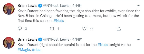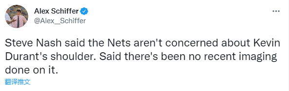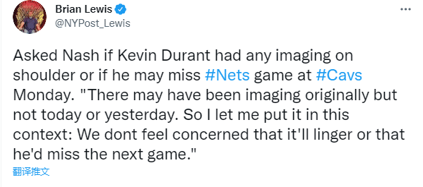 对于杜兰特的伤势,篮网主帅纳什表示杜兰特已经受肩膀伤势困扰一段时间了,经过背靠背的比赛后,这是让他休息的好时机,对他来说没有什么比休息更重要了;纳什还透露篮网并不担心杜兰特的肩伤,之前对杜兰特进行了检查,但最近没有对他进行进一步的成像检查,他们也不担心杜兰特缺席下一场比赛。