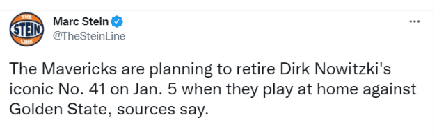 诺维茨基在2019年4月宣布退役,21年NBA生涯全部奉献给了独行侠。球队原本计划很快为他举办球衣退役仪式,但新冠疫情让他们只能推迟计划。