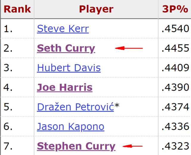 值得一提的是,塞斯-库里的生涯三分命中率是44.55%,目前在联盟历史上排名第二,仅次于史蒂夫-科尔(45.40%),而他的哥哥斯蒂芬-库里生涯三分命中率是43.23%,目前排在历史第七,在现役球员中仅次于他的弟弟塞斯和篮网射手哈里斯(43.90%)。