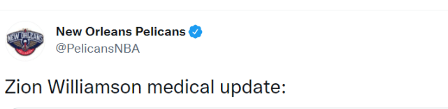 当地时间11月11日,鹈鹕曾对锡安的右脚进行扫描检查,当时医生就表示情况乐观,他的下一次扫描检查被安排在11月24日,届时医生们将再次评估锡安的伤情,来决定他是否可以参加全部训练。鹈鹕官方表示到时候他们会再次更新锡安的伤病进展。