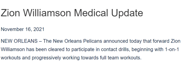 来源:JRS直播网11-17 15:27JRS直播网11月17日讯 ,新奥尔良鹈鹕官方更新了锡安-威廉姆森的伤情。他已经获准参加对抗训练,开始一对一的练习,向参加球队全部训练的目标继续前进。