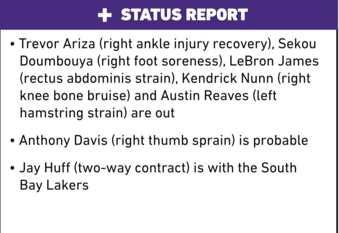 湖人队对阵雄鹿的伤情报告已经出炉,詹姆斯(腹部拉伤)、阿里扎(脚踝伤势)、纳恩(膝盖骨挫伤)、里夫斯(腿筋拉伤)和敦布亚(右脚酸痛)都因伤缺席,浓眉大概率出战(75%可能性),胡夫又被下放到发展联盟;湖人伤病名单上还有6名球员,詹姆斯和浓眉都在列,预计浓眉会带伤出战雄鹿。