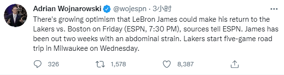 来源:JRS直播网11-17 11:22JRS直播网11月17日讯 , 据ESPN名记沃纳罗斯基报道,据消息人士透露,他们对湖人球星詹姆斯的伤情感到愈发乐观,将有望出战本周六的比赛,不过这意味着詹姆斯将会缺席下一场与雄鹿的比赛。