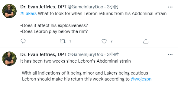对于詹姆斯的情况,医学专家Evan Jeffries表示詹姆斯应该会在本周复出,他复出需要注意的是这次伤病会不会影响他的爆发力?詹姆斯还会不会持球杀到禁区?