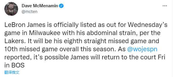 据ESPN记者Dave Mcmenamin报道,湖人队已经正式确认,勒布朗詹姆斯因腹部拉伤将缺席与密尔沃基雄鹿的比赛,这将是他本赛季连续第八场因伤缺席比赛,也是本赛季缺席的第10场比赛。
