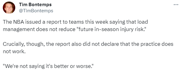 今日多名球星轮休,名记Tim Bontemps再次报道,联盟本周向30支球队发布了一份长达57页的分析报告,称负荷管理并不能降低在比赛中的受伤风险,这份报告分析了出勤率、赛程强度、累积出场次数和伤病的关联,报告得到的结论是均无关联。报告最后总结道:分析结果认为,缺席比赛/轮休/负荷管理/比赛间休息时间拉长,都没有证据表明可以减少未来在赛季期间发生的伤病风险。