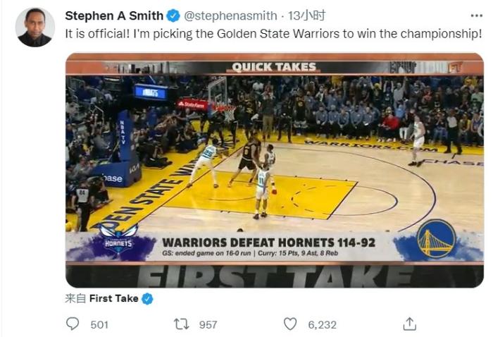 名嘴A史密斯在节目中表达了他对勇士的看好:“官宣了!我正式选择金州勇士会赢得总冠军!加里-佩顿打出了好多个高光镜头,乔丹-普尔,我是他的忠实球迷,史蒂夫-科尔也做出了了不起的工作,如果克莱和怀斯曼回归,那勇士就会是总冠军。”