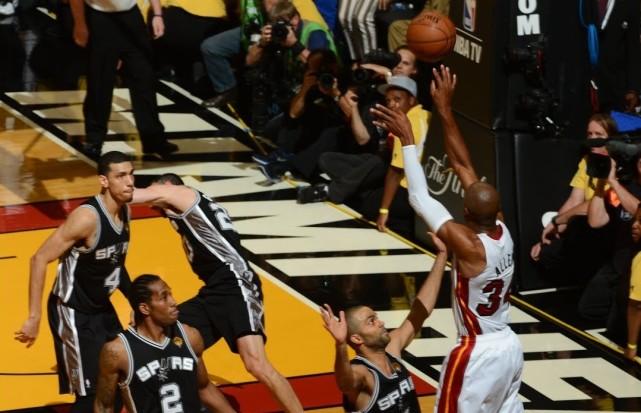 雷-阿伦在关键时刻的高光,主要是令人印象深刻的三分球。2006年,他曾在一场双加时比赛中为球队命中压哨三分,以152-149获胜。当然,价值更高的是2013年总决赛第6战的那记扳平三分,没有这一球,热火已经要见证马刺庆祝夺冠了。最终,热火赢下了那一年的总冠军。自2000年以来,阿伦在季后赛的关键时段有效命中率高达77.1%,排名第一,而他的季后赛关键时段的13个进球,也仅落后于詹姆斯、杜兰特、科比和皮尔斯。