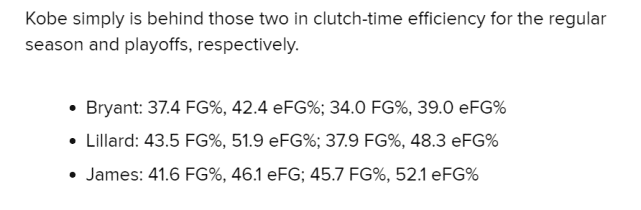 科比只排在第三?B/R调侃说肯定很多人要抱怨这份排名很垃圾:让数据来说话吧。最近,詹姆斯在关键时刻进球数上超越科比(133个),而科比在季后赛关键时段的进球数(17个)和杜兰特并列第二。科比在关键时刻的进球数方面没问题,但他在命中率方面落后于詹姆斯和利拉德。科比常规赛关键时段的命中率是37.4%,有效命中率是42.4%;季后赛关键时段的命中率是34%,有效命中率是39%。