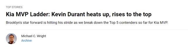 杜兰特的神奇表演还在继续,数据显示,如果他能保持目前的命中率和得分,他将成为过去35年来第二位赛季场均25+分,且命中率在55%以上的非大个子球员,第一位是詹姆斯。杜兰特认为篮网正在渐入佳境,而他在这套体系中也感觉越来越舒适。