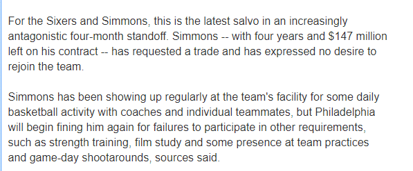 此前76人曾取消对西蒙斯的罚款,把他列为因个人问题而缺席比赛,但西蒙斯拒绝让球队帮其解决心理问题,双方之间的矛盾再次激化,因此76人又采取强硬手段,继续对西蒙斯进行罚款,并且每场罚款36万美元。