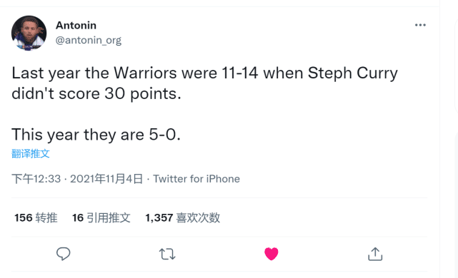 上个赛季,当库里得分低于30分的情况下,勇士只取得了11胜14负的战绩。而来到本赛季,库里有5场比赛低于30分,但勇士取得5胜0负。一方面,是因为勇士本赛季在进攻端得分点更多了,另一方面,就在于勇士防守变得更强了。即便库里手感不佳的夜晚,勇士也能依靠强硬的防守获胜。这个赛季的勇士注定不简单,尤其是考虑到汤普森也即将迎来复出。