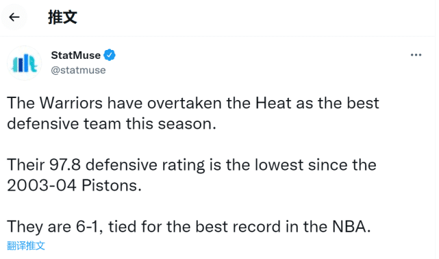 罗齐尔和拉梅洛鲍尔这对黄蜂后场双枪,前者12中2,后者14中5,合计被勇士防到26中7,而且还有多达7次失误。除此之外,勇士旧将乌布雷更是被防到得分挂零。据statmuse统计,拿下这场胜利后,勇士本赛季的防守效率提升到97.8,超过热火升至全联盟第一,这是03-04赛季活塞队以来的最佳防守效率。最近4场比赛,勇士3次限制对手得分不过百,上一场只让雷霆得到82分。