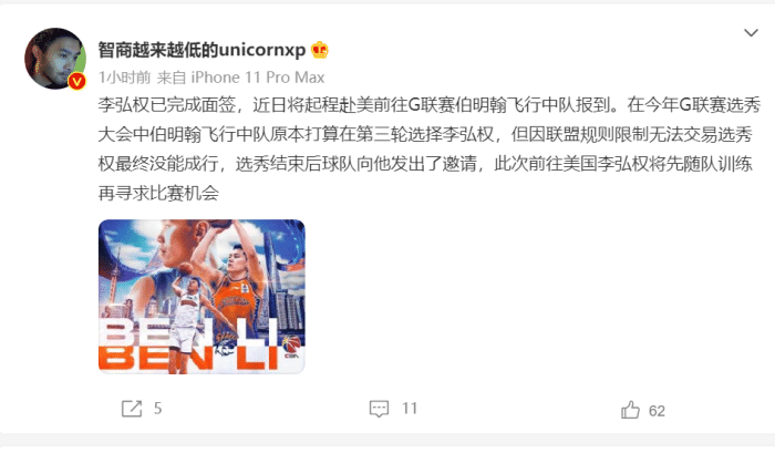 在前不久的发展联盟选秀中,李弘权“落选”王健解释并不是落选伯明翰飞行中队原本打算在第三轮选择李弘权,但因联盟规则限制无法交易选秀权最终没能成行,选秀结束后球队向他发出了邀请。所以新赛季我们有望看到发展联盟的“中国德比”