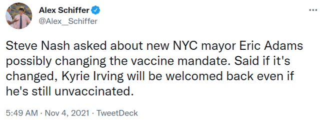 纳什在今天的采访中,也谈到了新任市长可能会改变防疫规定的消息。他表示,如果规定改变,球队将欢迎欧文回归,即便他依然是没有接种疫苗的状态。