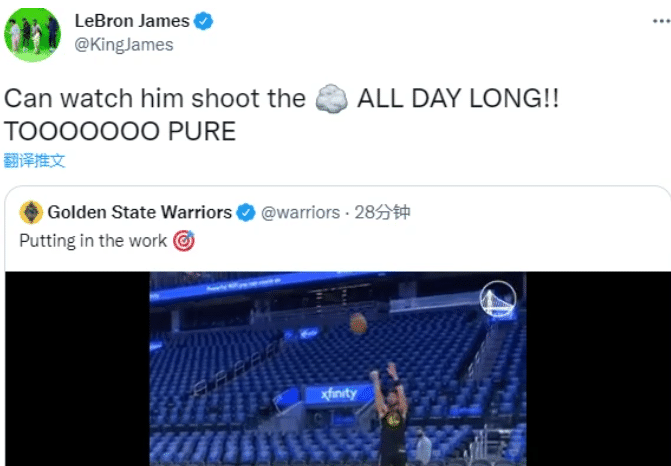 詹姆斯看到克莱恢复良好,也进行转发,称:“克莱投篮我可以看上一整天!太纯粹了!”