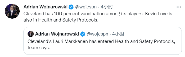 骑士官方宣布,马尔卡宁触发健康与安全防疫协议,确定缺席与开拓者的比赛,预计缺席几场比赛,骑士全队都已接种疫苗,但马尔卡宁和乐福仍旧因违规而被隔离。
