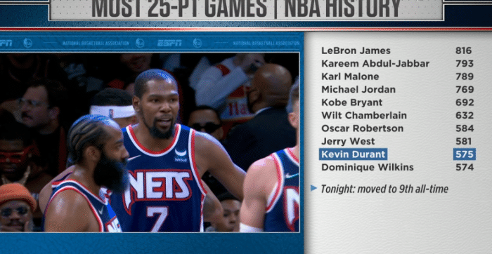 杜兰特职业生涯已经575次单场至少得分25+,正式超越老鹰名宿威尔金斯升到该榜单历史第九位,现役排名第二位,接下来的目标是湖人名宿杰里-韦斯特和大O罗伯特森,本赛季有望超越他们;目前詹姆斯生涯816次单场25+排名历史第一。
