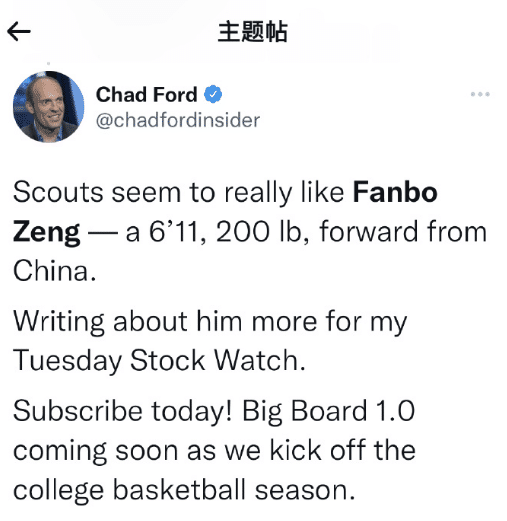 而NBA选秀专家查特福德也是在自己的选秀榜单中提到了曾凡博选秀抢眼,更是有一众NBA球探认为如果曾凡博能够保持持续进步的话,他是有希望进入NBA首轮的。