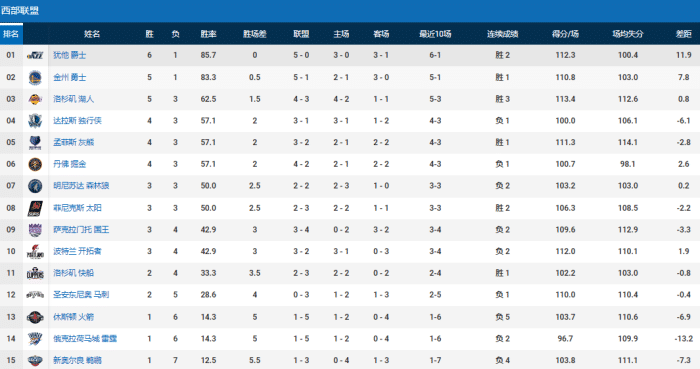 西部最新排名!爵士6胜1负霸榜,湖人双杀火箭,太阳逆转升前八