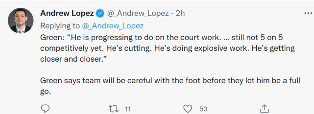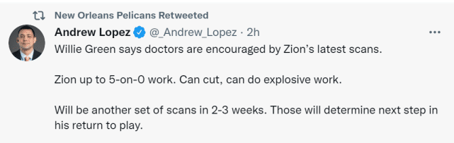 休赛期,锡安接受了一次脚部手术,修复骨折的第五跖骨。目前,他还在恢复之中。鹈鹕主帅威利-格林告诉记者,锡安取得了一些进展,预计在2-3周后再进行检查,来决定他是否可以参加5对5的对抗训练。