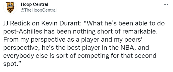 来源:JRS直播网11-02 15:40JRS直播网11月02日讯 前NBA球员JJ-雷迪克的言论引争议,他公开表示:杜兰特在跟腱断裂之后仍旧表现出色,从我和我的同龄人的角度来看,杜兰特是NBA最好的球员,其他人都是来争第二名的。