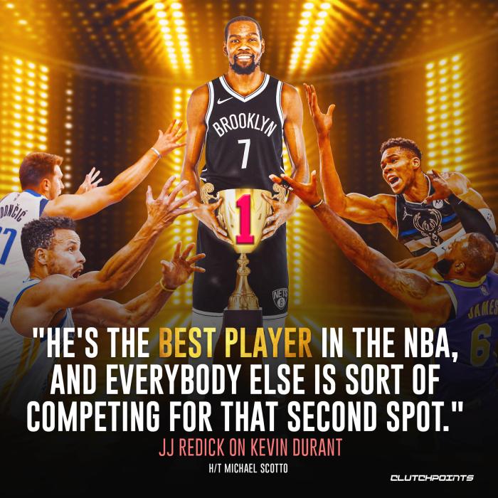 对于雷迪克的言论,美媒ClutchPoints晒图恶搞,在图中杜兰特双手抱着1号奖杯,詹姆斯、库里、字母哥和东契奇都伸手去抢;那么你觉得杜兰特已经成为联盟第一人了吗?