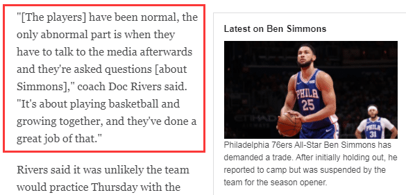 面对上班打卡领工资的西蒙斯,作为主教练的里弗斯确实放弃了,此前一次采访中里弗斯就对球队总被问及西蒙斯一事感到无语,并直说这是一个不正常的现象。显然,在里弗斯眼中球队一切正常,唯一不正常的就是总被问到西蒙斯的问题,或许在里弗斯心中西蒙斯已经不再是76人的一员。