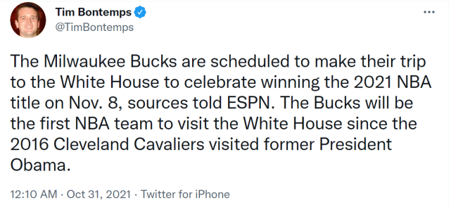 来源:JRS直播网10-31 11:39JRS直播网10月31日讯 ,据NBA记者Tim Bontemps报道,作为2020-21赛季的总冠军,密尔沃基雄鹿计划在11月9日(当地时间11月8日)访问白宫。自2016年的骑士之后,雄鹿是第一支访问白宫的NBA球队。