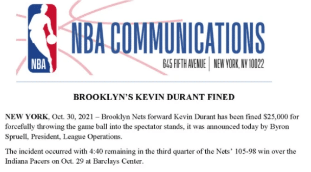 NBA官宣罚单!杜兰特故意扔球被罚2.5万美元,不当行为险被罚下