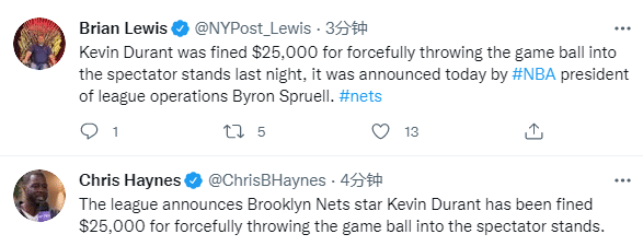 果不其然,杜兰特的罚单已经来了,扔球吃T还被追加罚款2.5万美元。