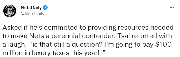 篮网本赛季要交1.104亿美元的奢侈税,仅次于勇士(1.599亿)排名联盟第二。