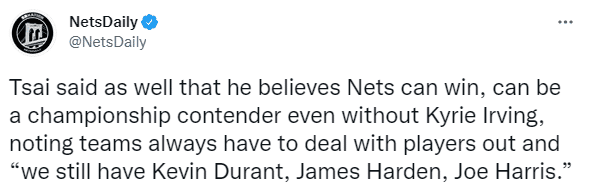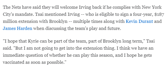 谈到欧文因拒绝接种疫苗而被球队禁赛,从而无法为篮网出战,蔡崇信表示他相信篮网可以赢球,即便没有欧文,篮网也可以成为总冠军的有力争夺者,球队总是需要处理球员的问题,就算欧文没法打,我们还有杜兰特、哈登、乔-哈里斯。