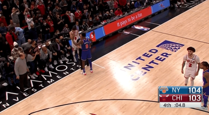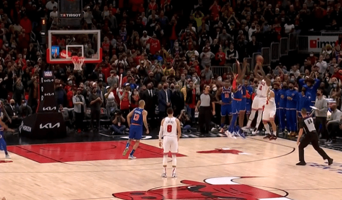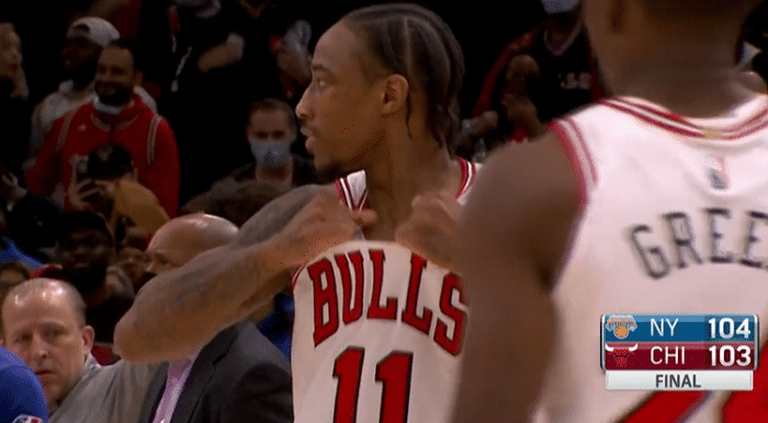 比赛还剩下3分钟的时候,随着兰德尔的补篮得分,尼克斯104-91公牛,占据优势。紧接着武切维奇和拉文连续两罚全中,德罗赞也打成2+1,在还剩下1分2秒的时候,公牛落后6分,重新看到希望。