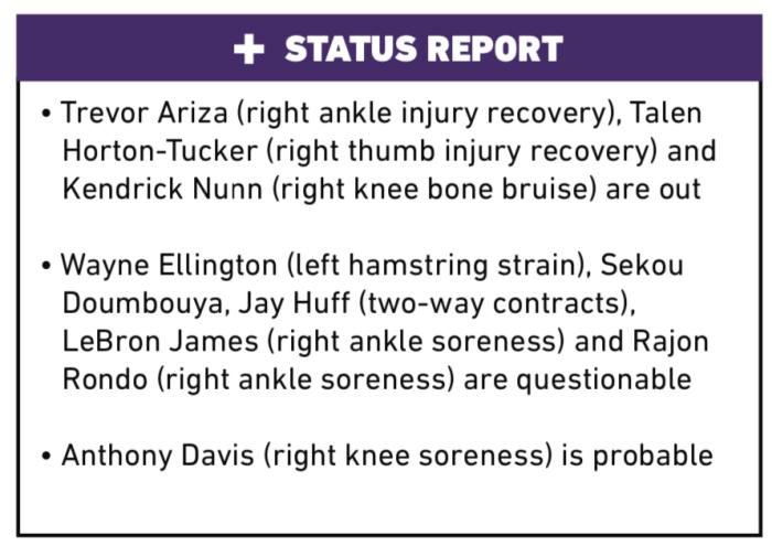 湖人全队3人继续伤停,6人出战成疑,其中浓眉大概率出战;朗多是在上一场比赛中受伤的,崴脚后重返赛场,伤势应该无大碍。
