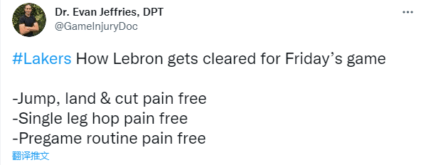 此前在湖人对阵雷霆赛前,詹姆斯参加赛前热身,似乎已经不受脚踝伤势的困扰;对于詹姆斯的复出情况,医学专家Evan Jeffries表示,詹姆斯需要在跳起、落地和空切没有痛感、单腿跳起无痛疼以及赛前热身不感到痛疼,在这样的情况下,詹姆斯才能复出。