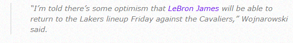 詹姆斯何时才能复出?据ESPN名记沃纳罗斯基在节目中透露,詹姆斯有望在明天对阵骑士的比赛中复出;因右脚踝酸痛,詹姆斯已经连续缺席两场比赛,有望复出战旧主。