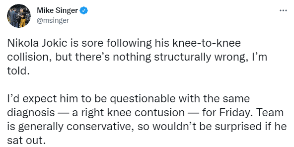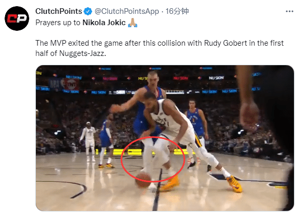 上一场掘金110-122不敌爵士,约基奇仅仅只打了上半场,上场15分钟9投8中轰下24分6篮板6助攻打爆爵士内线;可是在一次防守时,约基奇被戈贝尔撞伤膝盖,当时约基奇痛苦地坐在地板上,初步确诊为右膝挫伤并且退出比赛。