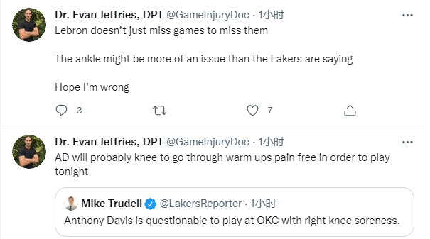 詹姆斯因伤连续缺席两场比赛,右脚踝伤势真的很严重吗?上一场湖人加时险胜马刺,詹姆斯身穿便装并且坐在场边观战,还扮演助教指导队友;对于詹姆斯的情况,医学专家Evan Jeffries表示,詹姆斯并不只是缺席比赛这么简单,他的脚踝问题可能为湖人所说的更严重。