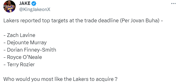 该记者还表示,若湖人愿意交易里夫斯,他们才可能达成关于穆雷的交易,此外联盟内部认为拉塞尔并不是具有吸引力的筹码。
