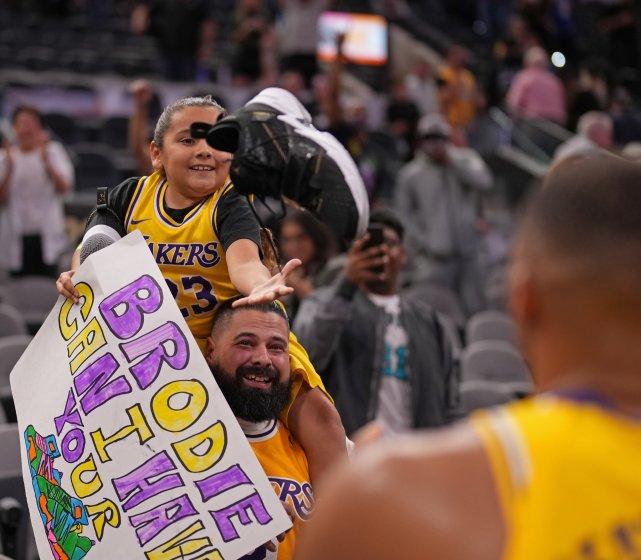 有记者拍下这暖心一幕,威少在客场经常会送鞋,而且目标通常都是小孩子。这位身穿湖人球衣的小球迷成为了幸运儿,她坐在父亲的肩膀上,接过了威少抛来的球鞋。要说人家也是早有准备,海报上都提前写好:“Brodie(威少的外号),我能拥有你的球鞋吗?”善良的威少怎么舍得拒绝呢?